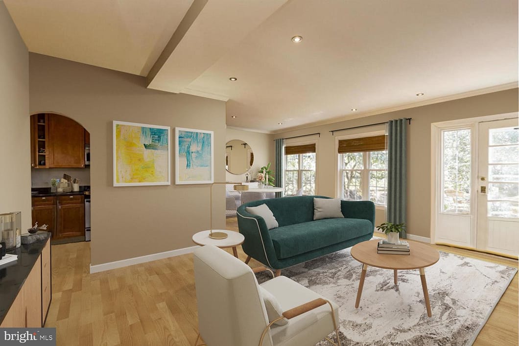 Ground floor patio condo with fabulous bamboo flooring throughout. Arched entryway to gourmet kitchen with granite counter tops, tile flooring, stainless steel appliances and gas stove. New bedroom A/C: 2022. New lighting 2020 in all rooms except bathroom: Bathroom has beautiful marble tiling and was updated in 2021. Convenient in unit laundry. Beautiful brick patio with park like setting for entertaining and grilling. Huge separate storage unit. Very easy commute to DC. This home is A+.